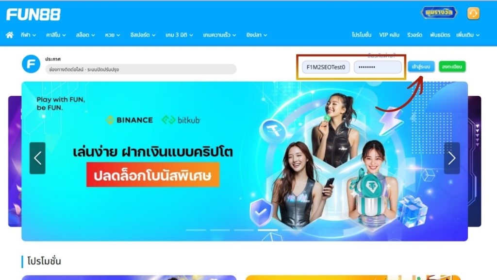 กรอกชื่อผู้ใช้และรหัสผ่าน เพื่อ FUN88 เข้าสู่ระบบ